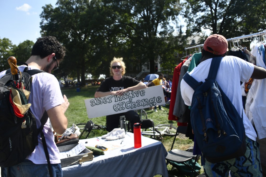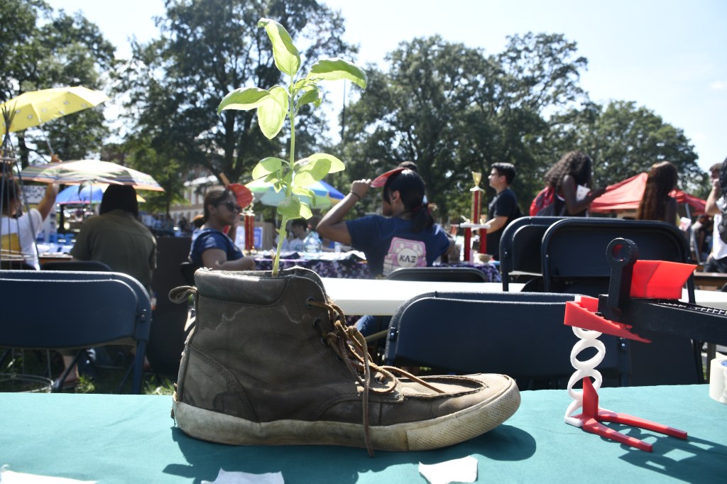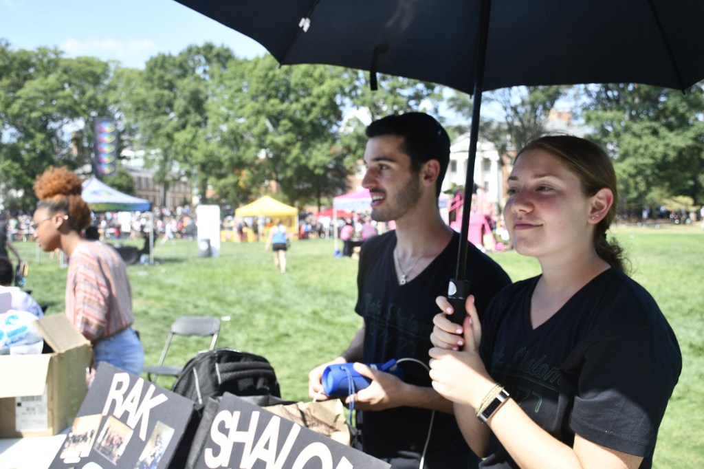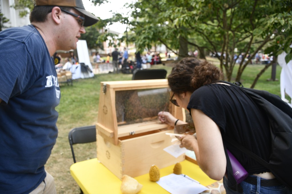 COLLEGE PARK, Md. — Ian Howard, left, a University of Maryland graduate student in plant science, explains bee behavior to the curious at UMD’s First Look Fair Thursday, Sept. 12, 2019. The fair, which is held every fall, showcases student organizations, academic programs and other student services. Howard was working the UMD Beekeeping Club’s table to recruit new members and explain the importance of bees. (Mary Lopez/Jour604)COLLEGE PARK, Md. — Ian Howard, right, answers questions about the UMD Beekeeping Club at the university’s First Look Fair Thursday, Sept. 12, 2019. Howard says club members meet on Saturdays to “go out to our bee yard and do bee things.” Members don a beekeeper’s suit, like the one in the foreground, to inspect the hives. (Mary Lopez/Jour604)COLLEGE PARK, Md. — Nadiv Panitch, left, a junior in computer engineering, and Sara Heckelman, right, a junior in the Robert H. Smith School of Business, shield themselves from the midday sun while promoting their club, Rak Shalom, at the University of Maryland’s First Look Fair Thursday, Sept. 12, 2019. The club is a coed Jewish a capella group, which performs at synagogues, schools and nursing homes across the country. They perform in both English and Hebrew, and they have a new album coming out soon, Heckelman said. (Mary Lopez/Jour604)COLLEGE PARK, Md. — Conor James, a senior English major at the University of Maryland, promotes Alternative Exchange at UMD’s First Look Fair Thursday, Sept. 12, 2019, as visitors check out a rack of used clothing. The organization’s purpose, James said, is to reduce waste by encouraging clothing swaps and other thrift exchanges, and they plan to hold pop-up thrift exchanges across campus. (Mary Lopez/Jour604)COLLEGE PARK, Md. — A solitary plant soaks up sun as students rush by at First Look Fair Thursday, Sept. 12, 2019. The fair is a tradition at the University of Maryland, serving as a showcase for the school’s many student organizations, departments and services. (Mary Lopez/Jour604)COLLEGE PARK, Md. — A plant in a shoe and some assorted office supplies are all that is left on an unstaffed table near the end of the final day of First Look Fair at the University of Maryland. (Mary Lopez/Jour604)COLLEGE PARK, Md. — The history of the history department is seen through the changing face of the faculty over the years. The photos, which hang in Francis Scott Key Hall at the University of Maryland, provide visual documentation of the passage of time. (Mary Lopez/Jour604)COLLEGE PARK, Md. — Two people practice juggling on the open green space of McKeldin Mall at the University of Maryland on a cool Friday afternoon Sept. 13, 2019. (Mary Lopez/Jour604)COLLEGE PARK, Md. — Two unicyclists pedal across McKeldin Mall at the University of Maryland on a cool Friday afternoon Sept. 13, 2019. (Mary Lopez/Jour604)COLLEGE PARK, Md. — 24 hours can make a huge difference. A quiet descends over McKeldin Mall Friday, Sept. 13, 2019, where just a day earlier almost 600 campus-related organizations blanketed the area for First Look Fair. (Mary Lopez/Jour604)