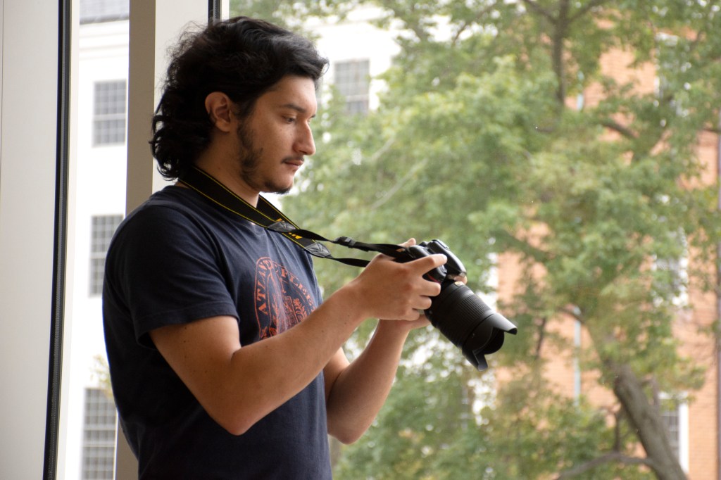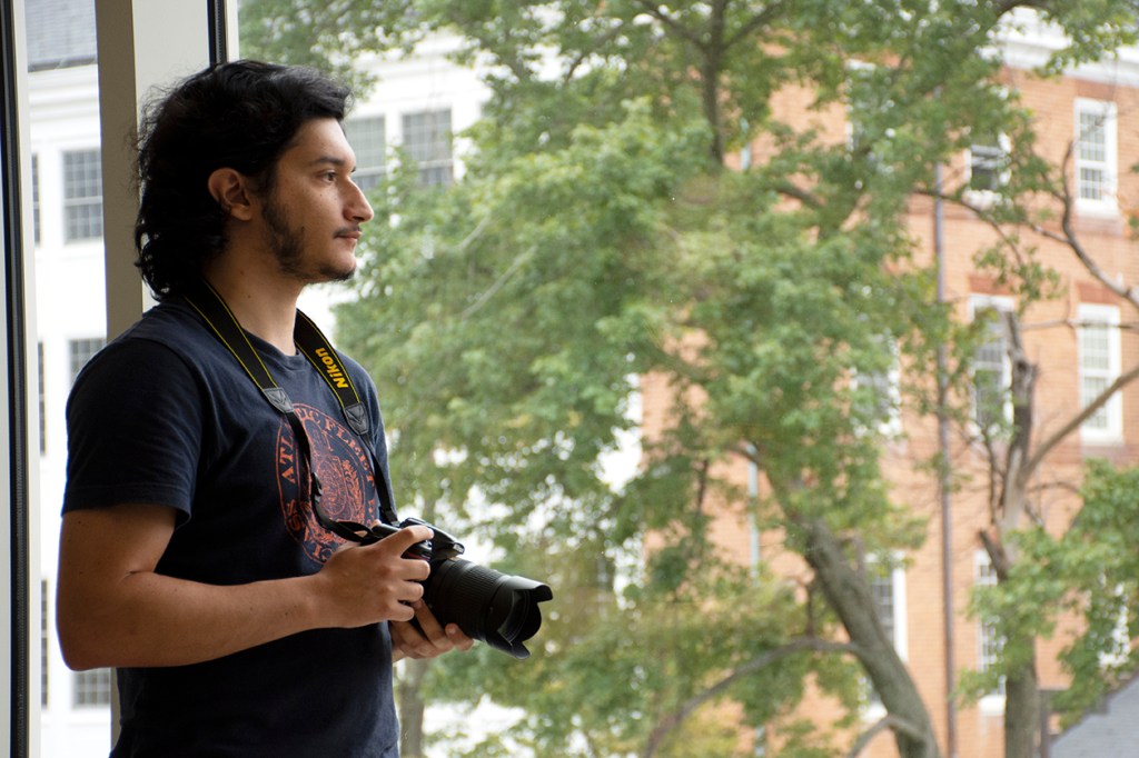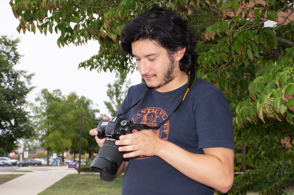 Yari Jamali poses for a photograph on a bench outside of Knight Hall at the University of Maryland on Sept. 14, 2019. (Noella Kertes/JOUR604) Yari Jamali assesses his camera settings before taking photos for a journalism class at the University of Maryland on Sept. 14, 2019. (Noella Kertes/JOUR604) Aspiring videographer and University of Maryland journalism student Yari Jamali poses with his camera inside Knight Hall on Sept. 14, 2019. (Noella Kertes/JOUR604) Rockville resident Yari Jamali glances down at his camera before taking portrait photos for his University of Maryland journalism class on Sept. 14, 2019. (Noella Kertes/JOUR604)