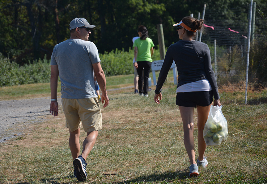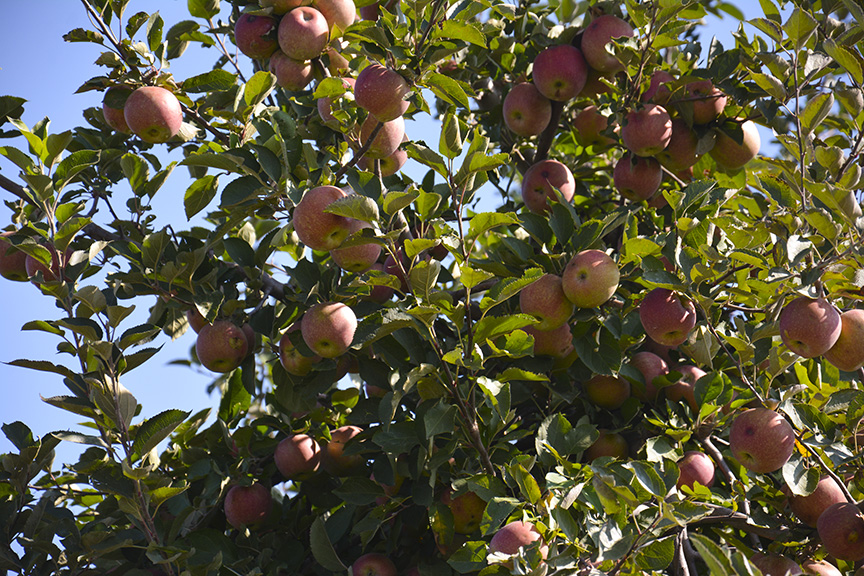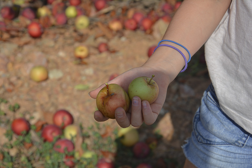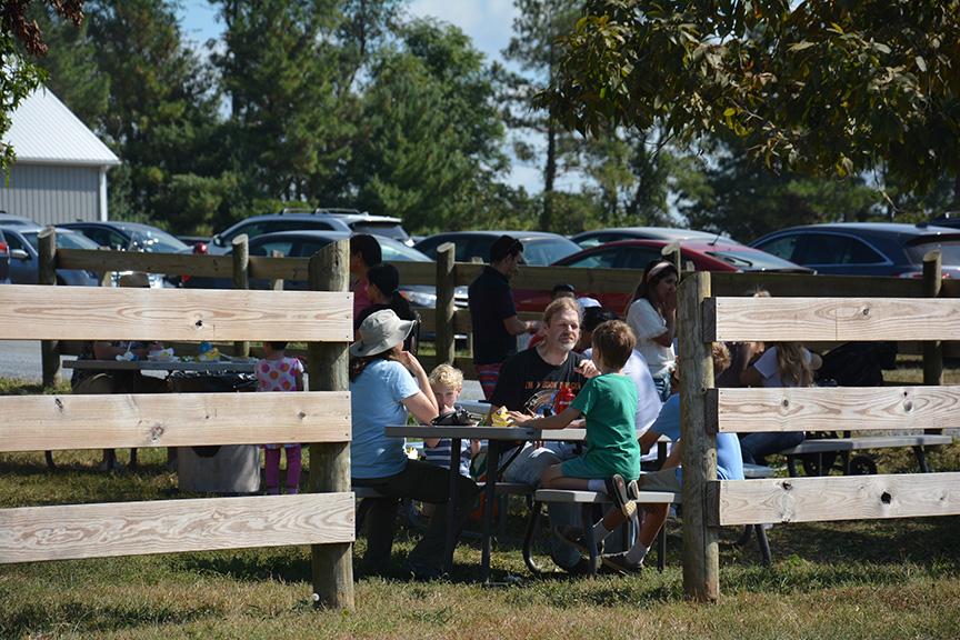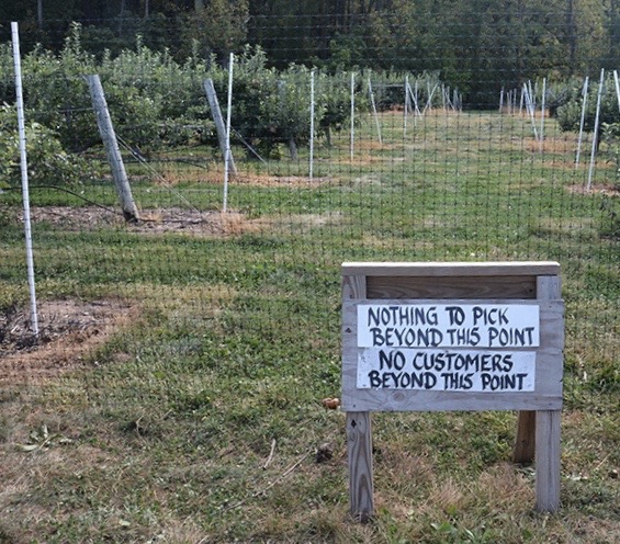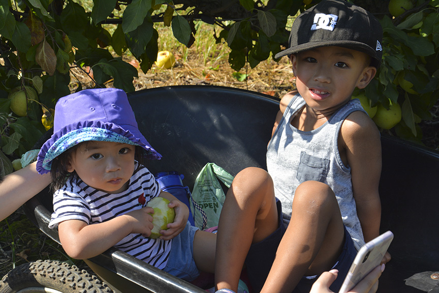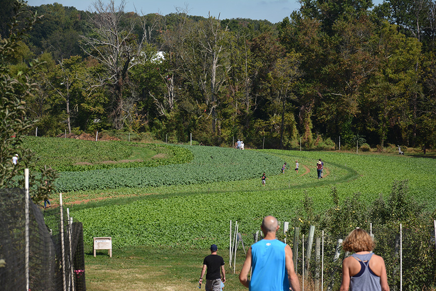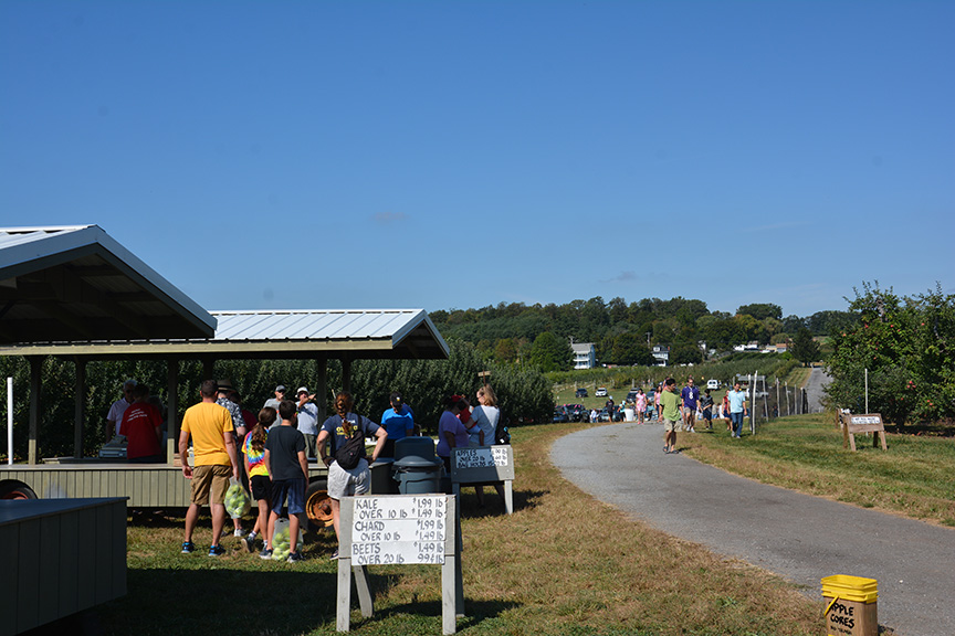 Nearly ripe apples are clustered near the top of trees at Larriland Pick-Your-Own Farm, Woodbine, Maryland, Sunday, September 29, 2019 (Taryn Faulkner/Jour604). The varieties currently ripe and ready for picking are Empire, Golden Delicious, Mutsu, and Sun Crisp. Larriland Farms is open to the public during growing season, Woodbine, Maryland, Sunday, September 29, 2019 (Taryn Faulkner/Jour604). There are cashiers and staff available at each picking field. Patrons check in to get a picking container and instructions on how to pick properly as well as which grove has the ripe fruit. Jamison (age 4) and Rosie (age 22 months) sit in one of the mini wheelbarrows provided for collecting the apples as Rosie samples the fruit, Woodbine, Maryland, Sunday, September 29, 2019 (Taryn Faulkner/Jour604). Emma Steffens (age 8) shows off the little apples she found growing on a single odd tree in the grove, Woodbine, Maryland, Sunday, September 29, 2019 (Taryn Faulkner/Jour604). In addition to apples, Larriland Farm has seasonal pick-your-own vegetables, including radishes, kale, beets, broccoli and chard. Pickers are making their way through the apple orchard to the vegetable patch, Woodbine, Maryland, Sunday, September 29, 2019 (Taryn Faulkner/Jour604). Parts of the extensive orchard are closed to the public because they have different varieties of apples that ripen at different times. That enables Larriland to provide picking through late October or early November, Woodbine, Maryland, Sunday, September 29, 2019 (Taryn Faulkner/Jour604). In addition to fruit and vegetable picking, there are picnic spots, food trucks, and a petting area, Woodbine, Maryland, Sunday, September 29, 2019 (Taryn Faulkner/Jour604). Larriland Farm is a nice spot for a day of family outdoor fun. An alpaca waits for a free food handout. There are food dispensers outside the pen for patrons to pay a small fee to get a handful of alpaca treats, Woodbine, Maryland, Sunday, September 29, 2019 (Taryn Faulkner/Jour604). A couple with a large quantity of apples heads to another grove for a different variety of apples, Woodbine, Maryland, Sunday, September 29, 2019 (Taryn Faulkner/Jour604).