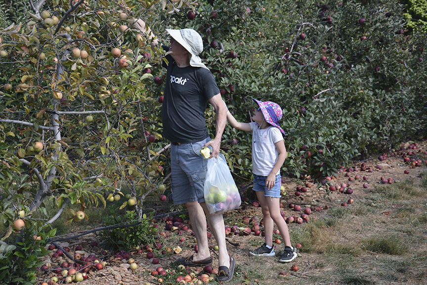 Roger Meszaros reaches for some tiny apples as directed by his granddaughter Emma Steffens (age 8), Woodbine, Maryland, Sunday, September 29, 2019( Taryn Faulkner/Jour604). The tree they are picking from is an anomaly in its row. It a different variety of apple than the rest in the row with tiny apples that delighted Emma.