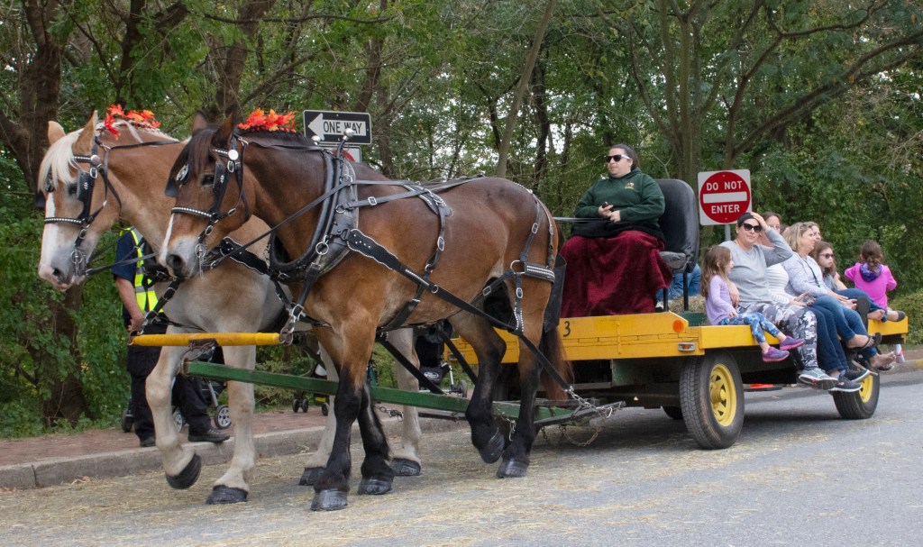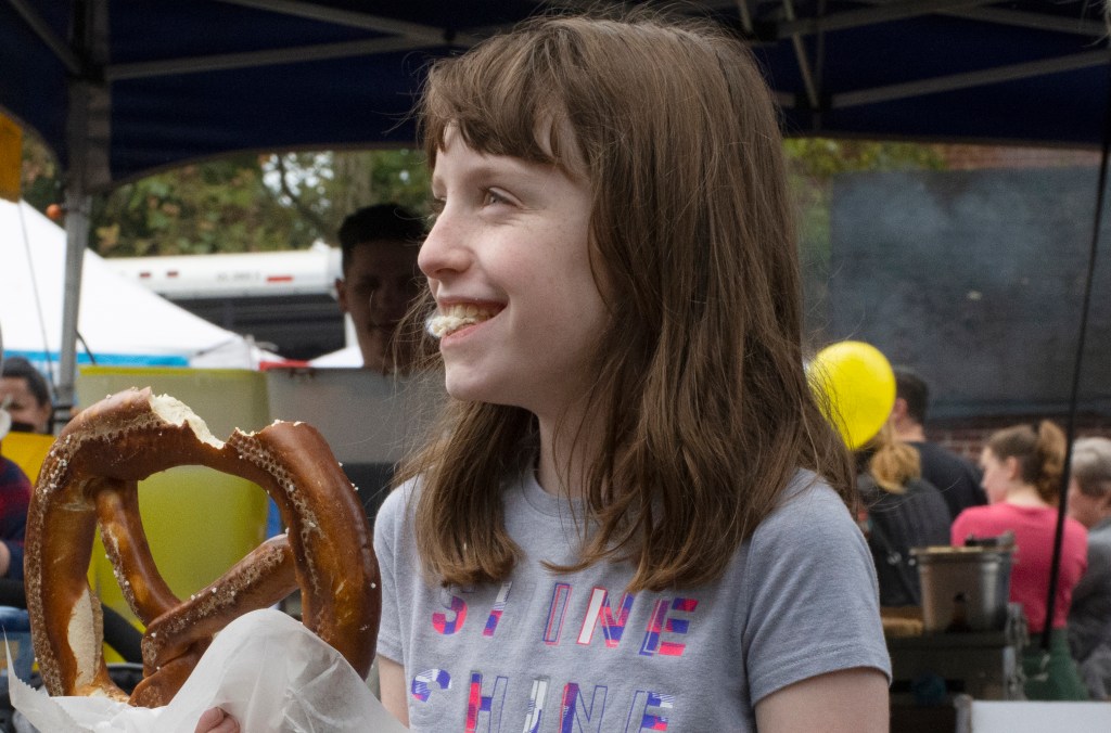 Brianna Teitelbaum, 10, of Germantown, MD, takes a bite of a giant Bavarian pretzel near the food stalls at Oktoberfest in Gaithersburg on Oct. 13, 2019. (Noella Kertes/JOUR604) Clad in traditional Bavarian clothing, the Alt-Washingtonia Bavarian Dancers perform on the main stage at the City of Gaithersburg’s Oktoberfest on Sunday, Oct. 13, 2019. (Noella Kertes/JOUR604) Erica McRae (left) and Chad McRae share a moment with their children, Patrick, 4 and Henry, 2. The family just moved to Gaithersburg, MD from San Francisco and heard about the Oktoberfest in their neighborhood. They came to check out the festivities on Sunday, Oct. 13, 2019. (Noella Kertes/JOUR604) A horse-drawn wagon ride is one of the most popular attractions at the City of Gaithersburg’s Oktoberfest on Sunday, Oct. 13, 2019. Horses pull passengers sitting on a long flat wagon around Inspiration Lake in the Kentlands neighborhood. (Noella Kertes/JOUR604) A little girl in pigtails reaches for a piece of Halloween candy laying in the outstretched wooden arm of a pumpkin sculpture at the City of Gaithersburg’s Oktoberfest on Sunday, Oct. 13, 2019. (Noella Kertes/JOUR604)
